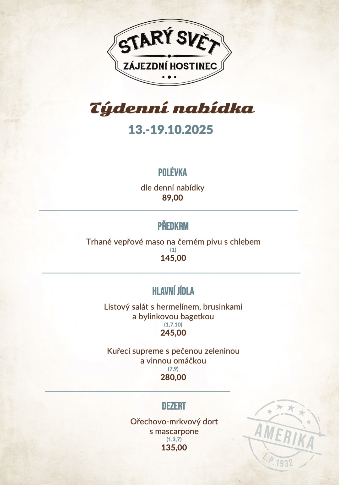 Víkend je před námi a s ním i skvělá příležitost vyrazit na Starý svět. Přijďte si vychutnat naše týdenní menu, které jsme připravili z poctivých surovin a s láskou k tradiční kuchyni. 🍲🥗🥩🍰