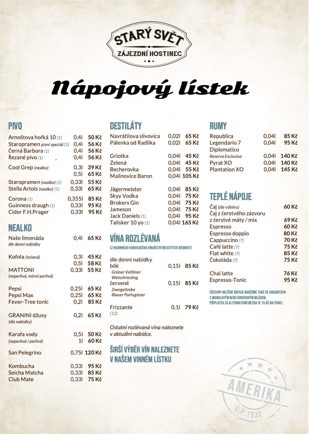 Avšak datování prvních záznamů o “hotelu Amerika” nás přivedlo na myšlenku obnovit, nebo alespoň přiblížit našim hostům časy dávno minulé. Dobu, kdy posezení s přáteli u dobrého jídla a pití bylo příjemnou a přirozenou součástí dnů všedních i svátečních. Nostalgii prvorepublikového života bychom rádi přenesli na každého, kdo k nám zavítá. Zpomalte své hektické životní i pracovní tempo a užijte si pohodu. Uspokojte tělo i duši a pokuste se s námi alespoň na chvíli vrátit do dob, kdy život plynul o něco pomaleji.
